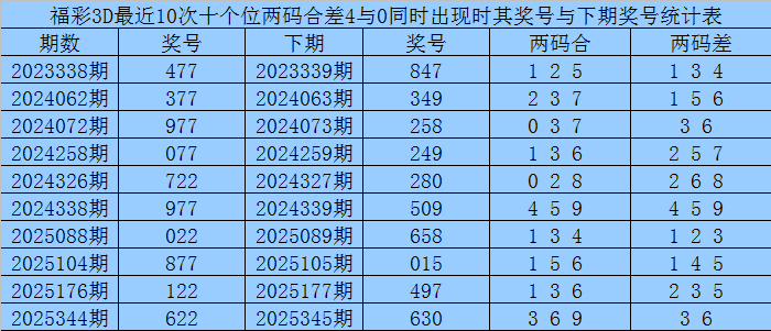 从以上统计不错看出,十个位两码合差4与0同期出现之后其下期两码合差施展最热的4个永诀为:1356,本期十个位两码合差不错参考这四码中的数据。