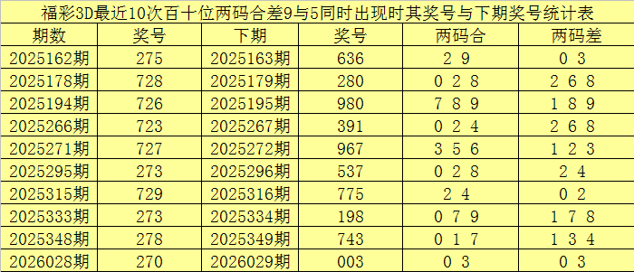 百十位合差分析:上期奖号百十位开出27组合,两码合为9,两码差为5,最近10次百十位两码合9与两码差5同期出刻下,其奖号和下期奖号永诀为: