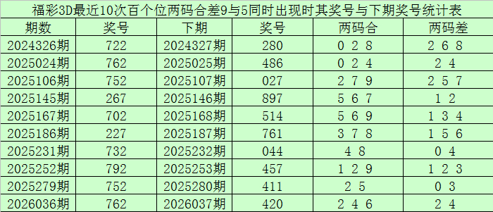 百个位合差分析:上期奖号百个位开出27组合,两码合为9,两码差为5,庄闲和app最近10次百个位两码合9与两码差5同期出刻下,其奖号和下期奖号永诀为: