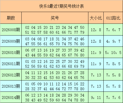 快乐8第2026014期奖号为:06 12 13 14 18 24 28 29 30 34 38 43 49 52 59 60 64 74 78 80,其中奖号012路比为7:7:6,大小比为9:11。