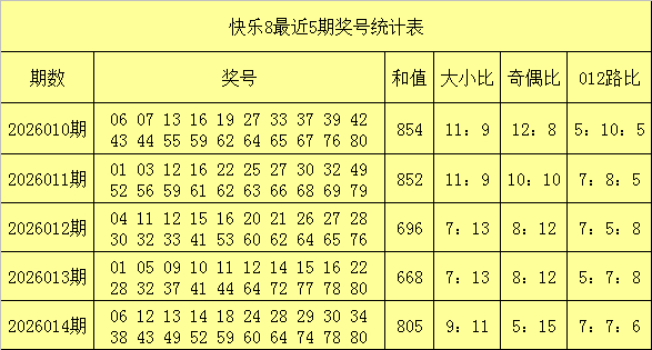 快乐8第2026014期奖号为:06 12 13 14 18 24 28 29 30 34 38 43 49 52 59 60 64 74 78 80,其中奖号012路比为7:7:6,跨度为74。