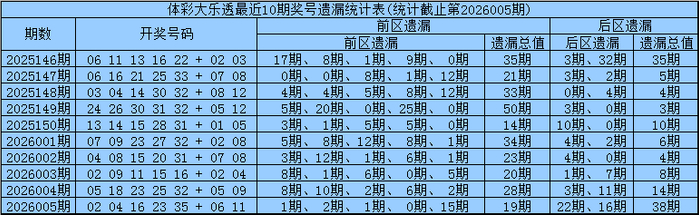 凡哥体彩大乐透第2026006期前区五区遗漏分析:(定义:遗漏0-3期号码为热码,遗漏4-9期号码为温码,遗漏10期及10期以上号码为冷码)