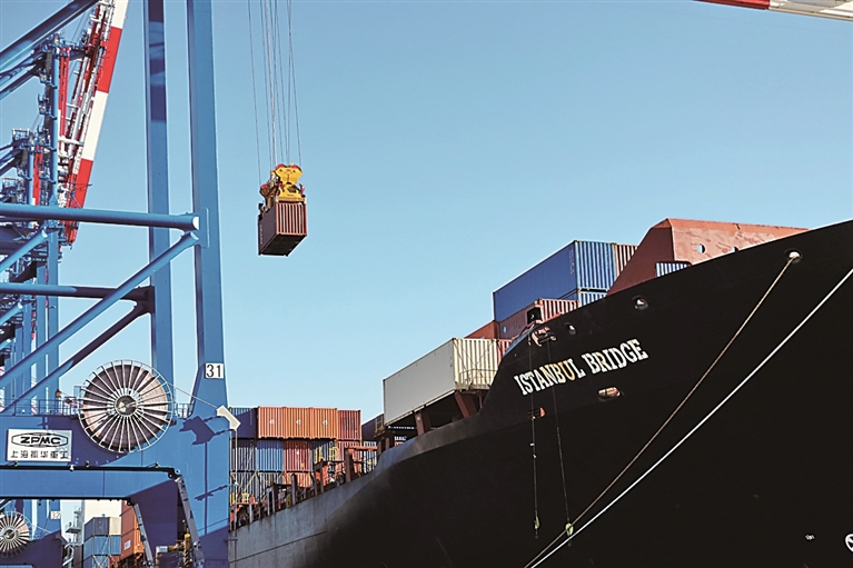 在波兰北部格但斯克港,从中国宁波舟山港出发的中欧北极快航航线首艘货船进行装卸工作。新华社发