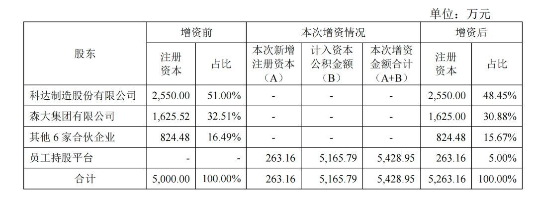 该次增资完成后,广东特福的注册资本由5000万元变更为5263.16万元,科达制造对其持股比例由51%变为48.45%。此外,森大集团有限公司、员工持股平台分别持有广东特福30.88%、5.00%股份。