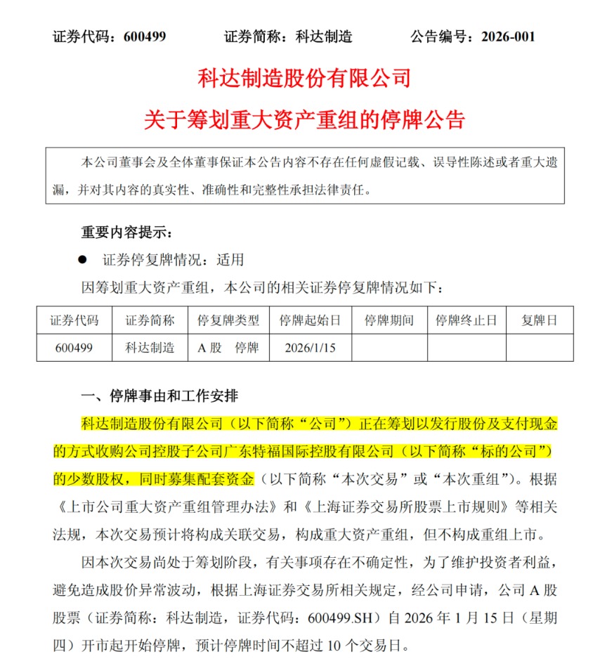 因本次交易尚处于筹划阶段,有关事项存在不确定性,为了维护投资者利益,避免造成股价异常波动,根据相关规定,经申请,科达制造A股股票自2026年1月15日开市起开始停牌,预计停牌时间不超过10个交易日。