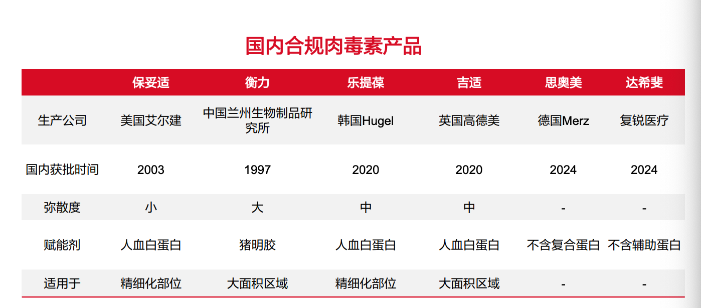 在此之前,我国合规上市的肉毒素产品已有6款,分别包括美国艾尔建的保妥适、中国兰州生物制品研究所的衡力、韩国Hugel的乐提葆、英国高德美的吉适、德国Merz的思奥美以及复锐医疗的达希斐。