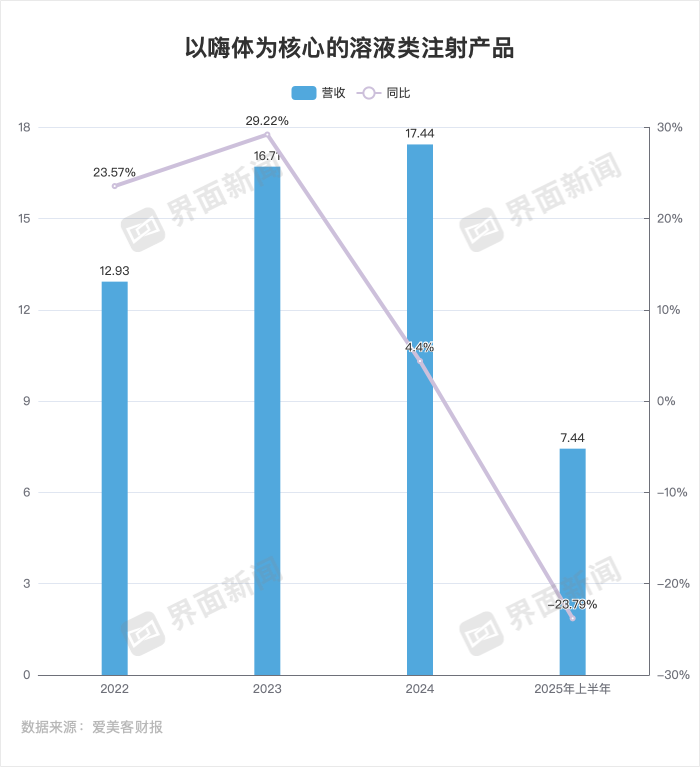 2022年至2024年,以嗨体为核心的溶液类注射产品分别营收为12.93亿元、16.71亿元、17.44亿元,同比增长23.57%、29.22%和4.40%。到了2025年上半年,嗨体为核心的溶液类注射产品营收为7.44亿元,庄闲和游戏app同比下降23.79%。