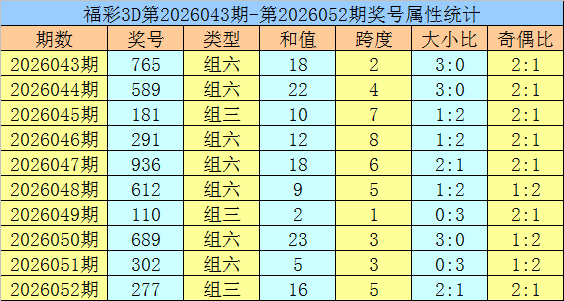 开奖追思:福彩3D第2026052期开出奖号277。奖号时势为组三,奇偶比为2:1,012路比为0:2:1,大小比为2:1,和值为16,跨度为5。