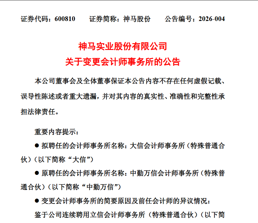 然而,中勤万信近期因“2025年度审计任务繁重、人员调整、其他项目时间安排变动等因素”,预计无法如期完成神马股份2025年度财务报告与内部控制审计任务。经沟通,中勤万信对此变更无异议,庄闲和并将按规定做好前后任会计师事务所的沟通配合工作。