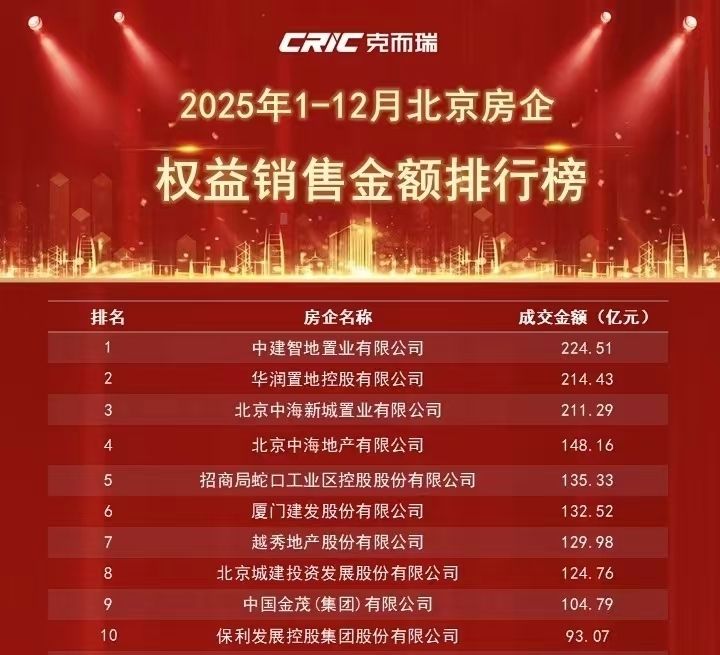 在2025年克而瑞发布的榜单中,则将中国建筑内各个地产公司分拆统计,中海地产也分拆成中海新城和北京中海统计。由此可见,中建智地、华润置地、中海新城位列2025年北京房企权益销售金额排行榜前三。