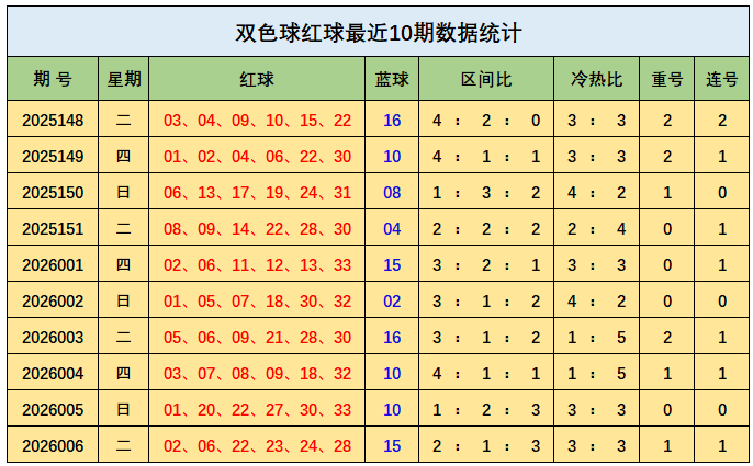 上期回顾:双色球第2026006期开出奖号:红球02、06、22、23、24、28;蓝球15,其中红球三区比为2:1:3,开出1枚重号22,开出1组连号22、23、24,蓝球开出四区号码15。