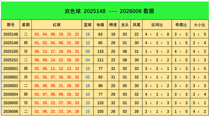 上期回顾:双色球第2026006期开出奖号:红球02、06、22、23、24、28;蓝球15,其中红球三区比为2:1:3,奇偶比1:5,大小比为4:2,蓝球开出0路号码15。