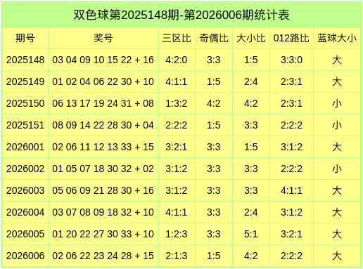 红球大小比为4:2,奇偶比为1:5,012路比为2:2:2,蓝球开出大数。