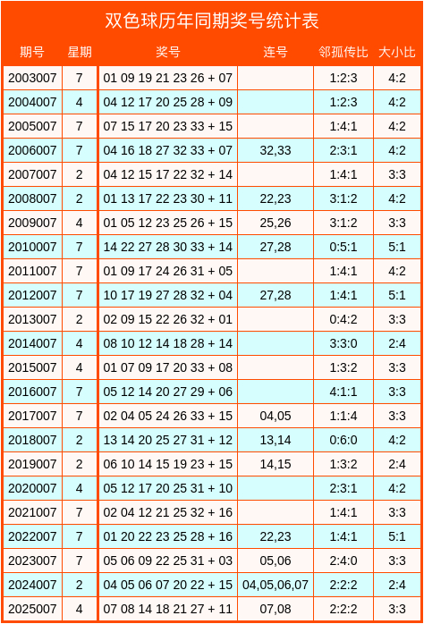 连号分析:历年同期中开出连号的概率为52.17%,去年同期奖号数据开出连号07,08,本期预测开出连号24,25。