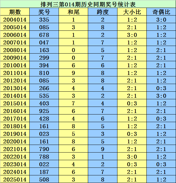 历年第014期排列三同期奖号开出:335、085、678、047、163、299、394、810、085、266、535、403、925、428、161、023、161、790、788、022、187、508。