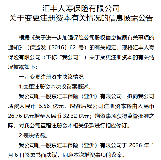 1月8日,汇丰人寿保险有限公司(下称“汇丰人寿”)披露公告称,公司唯一股东汇丰保险(亚洲)有限公司(下称“汇丰保险”)拟向公司增资5.56亿元。增资后,汇丰人寿注册资本将由26.76亿元增至32.32亿元,待上海金融监管局批准后生效。